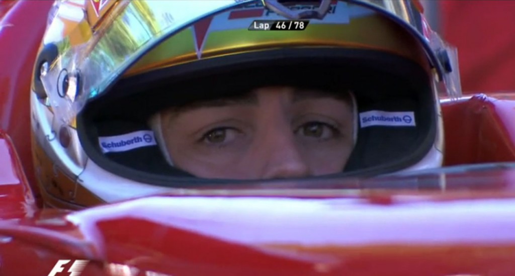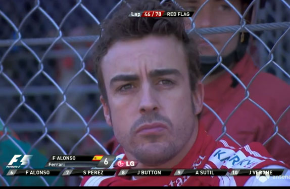 Alonso, fuera del coche, como todos, esperando a que despejen la pista. Sigue sexto. Su coche está en la sombra. Pérez ha intentado adelantarle y Alonso ha acortado por la chicane para evitar el roce o el choque, lo que está penalizado: podría tener que dejar pasar a Pérez. La pista se a convertido en un taller.