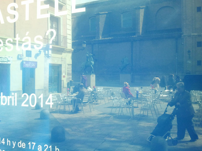 Al fondo uno de los caballos y los jinetes de Pablo Gargallo. Reflejo en la cristalera del Torreón Fortea.