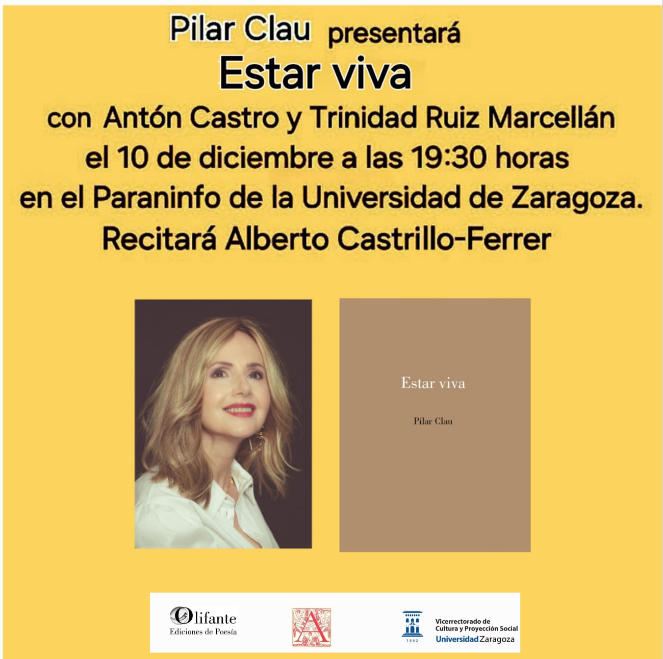 Presentación en Zaragoza del libro de poemas de Pilar Clau “Estar viva”, martes 10 diciembre, Paraninfo Universitario, 19,30 h. Con Trinidad Ruiz Marcellán y Antón Castro; recitará poemas Alberto Castrillo Ferrer