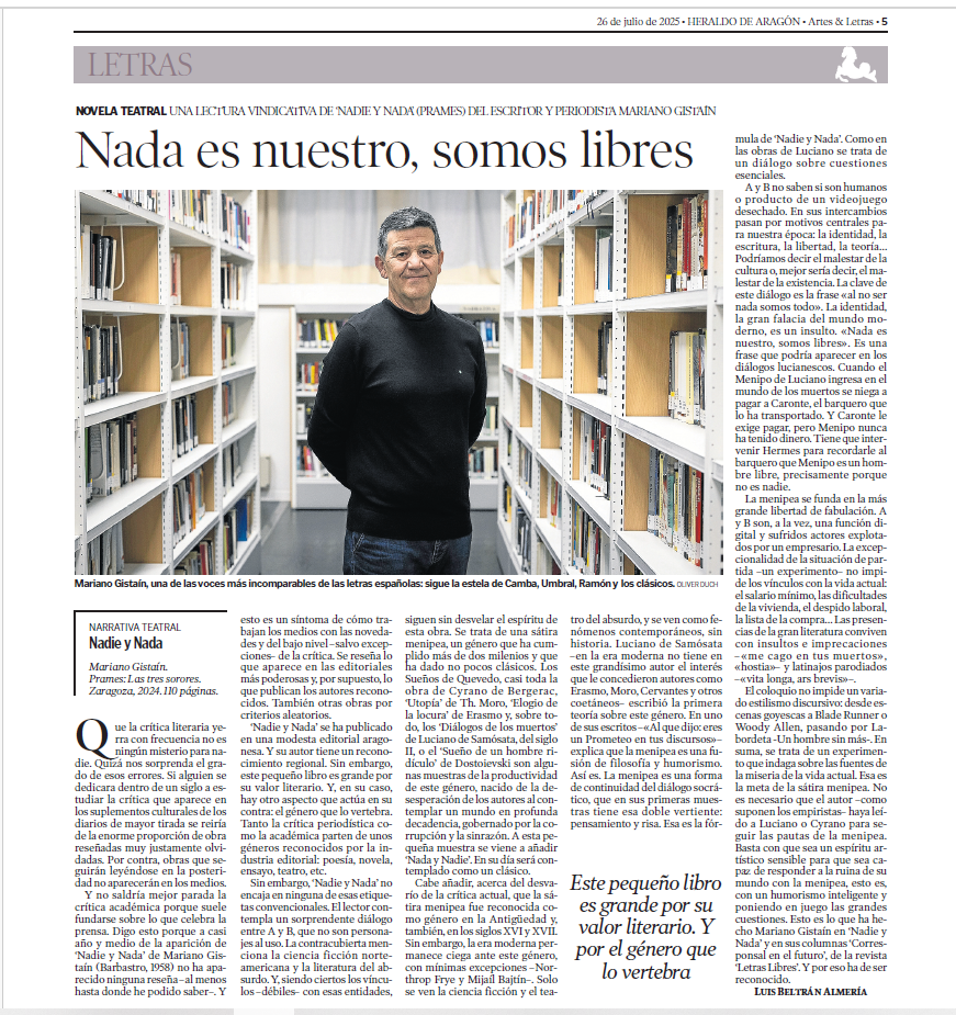 Reseña de Luis Beltrán Almería del libro de Mariano Gistaín “Nadie y nada” en Artes & Letras de Heraldo de Aragón